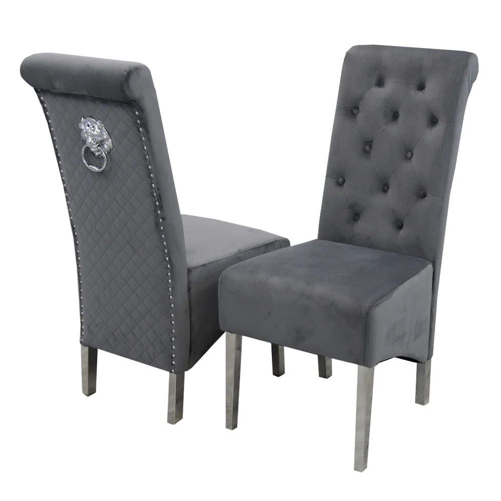 Add a touch of timeless glamour and sophistication to your dining space with our Luxury Louis Grey Marble Dining Table Set. Crafted to perfection, this stunning 1.5M table features a sleek grey marble top paired with four Lucy Lion Knocker dining chairs in plush grey velvet — beautifully detailed with cross stitching and a polished chrome lion knocker for that signature luxury look.