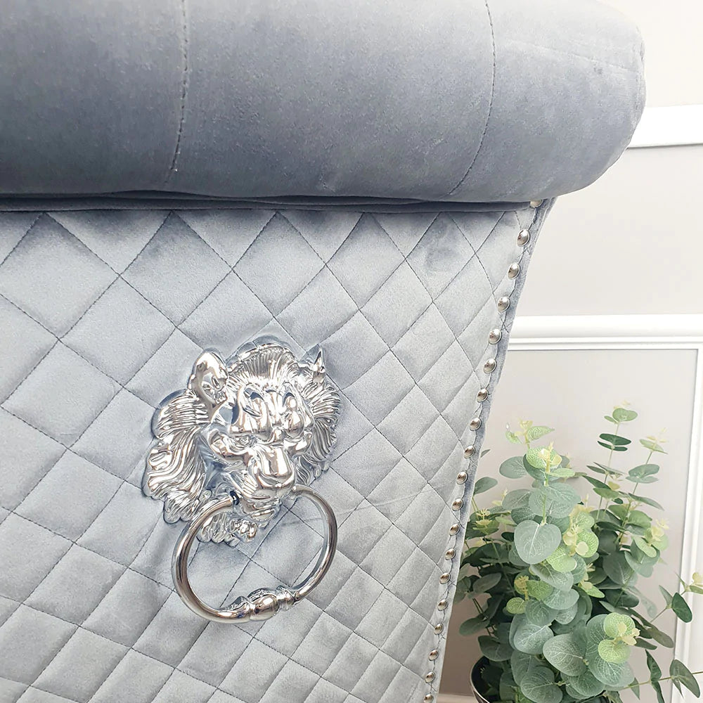 Bringing a special, contemporary approach, the Louis dining table is certain to wow visitors enabling you to eat in style, A wonderful, amazing marble top is done with smooth stainless steel legs. Priced with the new Lucy slim Lion Knocker Plush Velvet seat in grey plush velvet